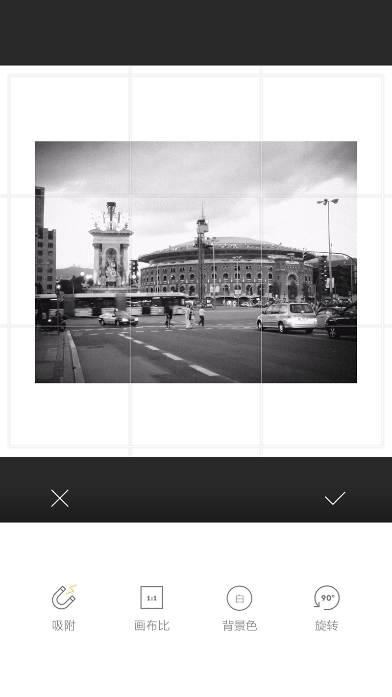 但如果照片放大到比画布还要大的时候的时候,「吸附」状态下的中心吸附就会消失,此刻就会变成边缘吸附。大家只需要了解这个功能多用于想让照片的某个角充满画面。此时如果处于「不吸附」的状态,则可以留白。